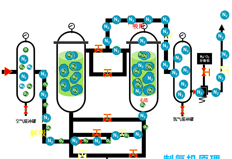 沸石分子篩對(duì)壓縮空氣中氧、氮分子存在吸附量差異主要是基于這兩種氣體在沸石分子篩表面上的擴(kuò)散速率不同。直徑較小的氣體分子(O2)擴(kuò)散速率較慢,直徑較大的氣體分子(N2)擴(kuò)散速率較快;同時(shí)在不同吸附壓力下,吸附壓力越高,吸附量越大。因此,利用沸石分子篩對(duì)氧和氮在某一段時(shí)間內(nèi)、不同壓力下吸附量的差別這一特性,由全自動(dòng)控制系統(tǒng)程序按特定可編程序施以加壓吸附產(chǎn)氣、常壓脫附再生的循環(huán)過(guò)程,完成氮氧分離,獲得所需不同純度的氧氣。